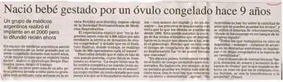 Un equipo de médicos argentinos asistió el nacimiento de un bebé gestado por un embrión congelado durante casi nueve años, “el de mayor tiempo que se registró hasta ahora”, indicó el ginecólogo Sergio Pasqualini, quién dirigió el trabajoEl niño ya tiene poco más de un año, pero el proceso llevado a cabo para su gestación será publicado esta semana en la revista Fertility and Sterility, órgano oficial de la Sociedad Norteamericana de Medicina Reproductiva. (...)